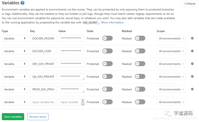 打开你的GitLab存储库,然后转到:Settings -> CI/CD 。在 Variables 部分中, 添加新变量: