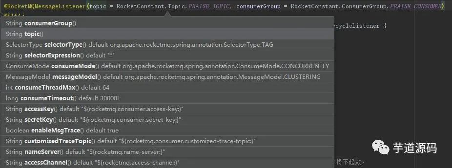 RocketMQListener的bean为一个消费者并监听指定topic队列中的消息,该注解中包含消费者的一些常用配置(大部分按默认即可),一般只需更改consumerGroup(消费组)与topic。