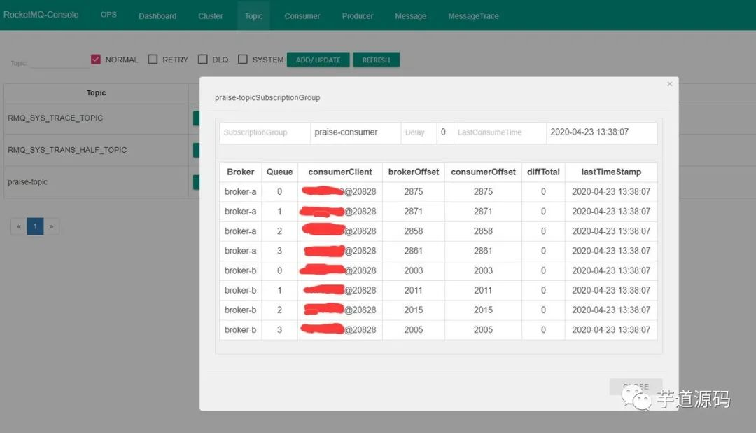 当把拉取数pullBatchSize设置Broker的默认最大传输值32了,线上又不想重启Broker更改maxTransferCountOnMessageInMemory参数,如有2个Broker且queue都为4,那么拉取消费效率才为32 * 2 * 4 = 256,如果想要动态调整,可以从Broker数或Broker队列数下手,可以将Broker的writeQueueNums、readQueueNums增大,如都改为8,那么效率就成了32 * 2 * 8 = 512。需要注意的是更改完queues后必须去Dashboard的Topic下的CONSUMER MANAGER查看新增的队列上是否都有Consumer成功注册上去了,因为遇到了在测试与生产上使用rocketmq-spring-boot-starter @RocketMQListener标注消费者不会自动注册到新队列上的情况,但没排除是不是RocketMQ版本的原因(个人本地的版本比环境上的高了一个小版本0.0.1,本地没出现没消费者注册到新队列上的问题),而是使用了自定义DefaultMQPushConsumer bean(原生的方式都是没有问题的)的备用方案。当再启动新的消费者应用时CONSUMER MANAGER(下图)中就会出现 新Consumer数 * 各Broker队列数和的队列行。