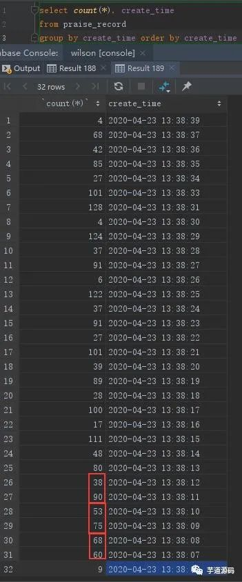 根据以上配置单Conumer情况下每2s理论消费为128,即每2秒数据库新增的点赞数据大概为128条左右,有20%偏差都在个人可接受范围内,然后对点赞接口进行简单压测1s 2000请求校验MQ效果,根据消费配置理论上需要16次拉取即需32s才能消费完,压测后查看数据库校验效果: