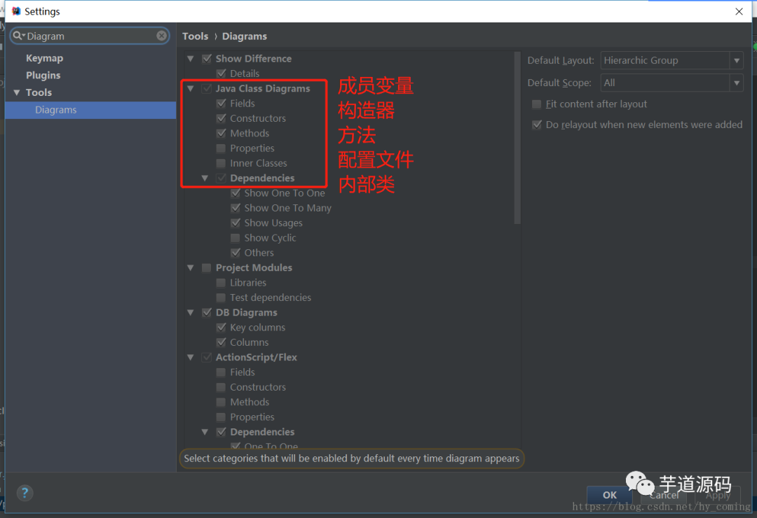如上所示,我们主要关心的只有Java Class Diagrams下面的几个单选框,分别对应红字部分,一般的UML类图只需要知道成员变量、构造器和方法(前面三个),其他的随意,设置好了之后我们就来演示一下,
