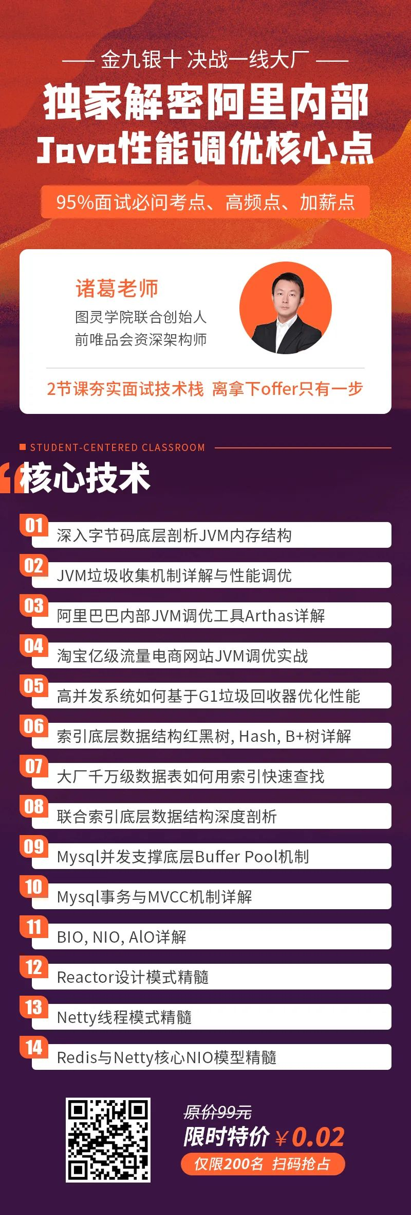 这些问题不解决,往往会大概率反复 CRUD,天天熬夜加班。如果你不想一直做默默无闻的 CRUDER,如果你想在团队有担当,或者你愿望很简单——就想钱多事少离家近,那建议你一定要啃下性能调优。这里推荐下图灵学院诸葛老师的《2天 Java 性能优化实战训练营》,超级干货。