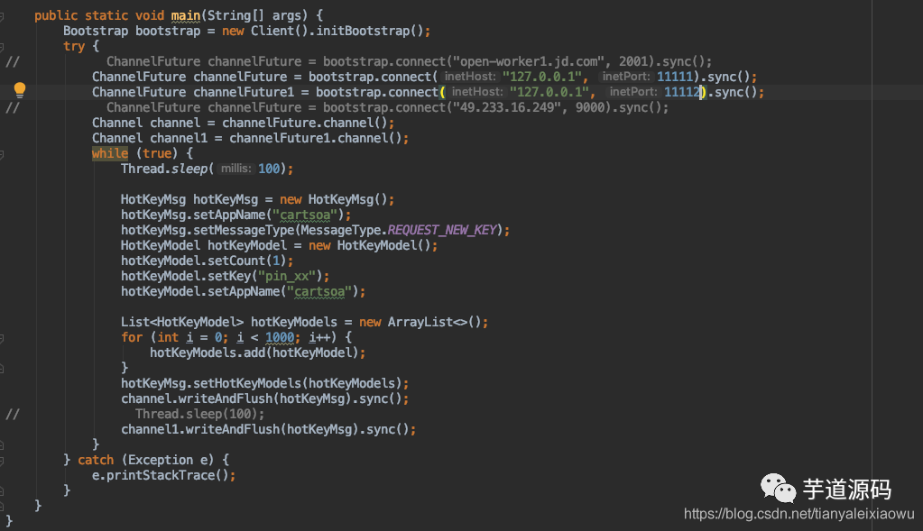 之后,我们再加点料,我启动两个Server,分别用两个端口,线上其实是两台不同的server服务器,client会同时往两台server死循环发对象,如下图代码。