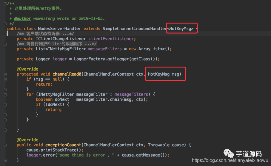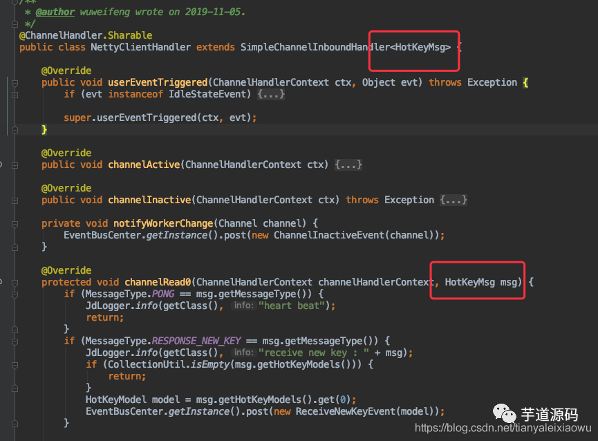 先看Decoder解码器,这个是用来netty收到消息后,进行解码,将字节转为对象(自定义的HotKeyMsg)用的。里面有一堆被我注释掉了,注释掉的,应该在网上找到的帖子都是那么写的。这种方式本身在普通场景下是没问题的,解码还算正常,但是当上几十万时非常容易出现粘包问题。所以我是在这个解码器前增加了一个DelimiterBasedFrameDecoder分隔符解码器。