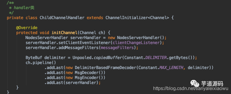 当收到消息时,先过这个分隔符解码器,之后到MsgDecoder那里时,就是已经分隔好的一个对象字节流了,就可以直接用proto工具类进行反序列化的。Constant.DELIMITER是我自定义的一个特殊字符串,用来做分隔符。