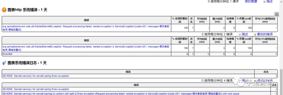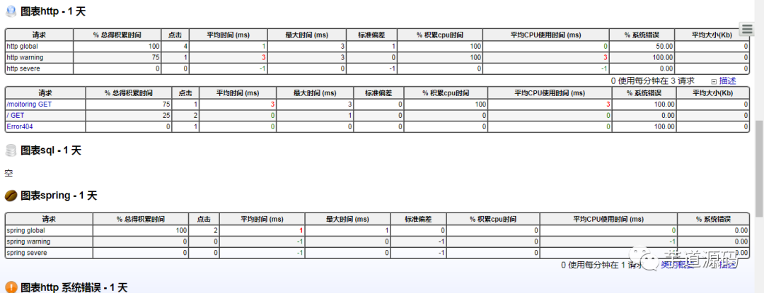 http请求、sql请求、jsp页面与业务接口方法(EJB3、Spring、 Guice)的执行数量,平均执行时间,错误百分比等