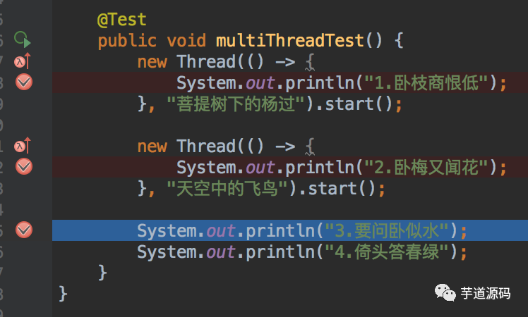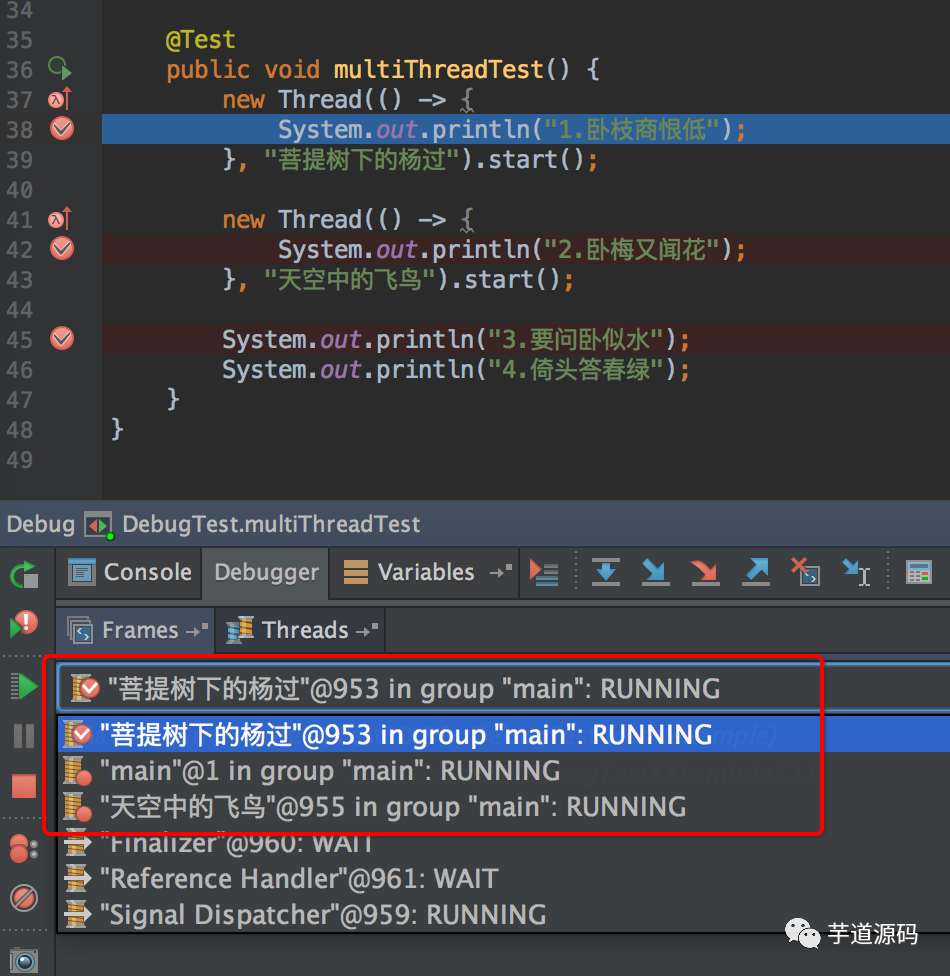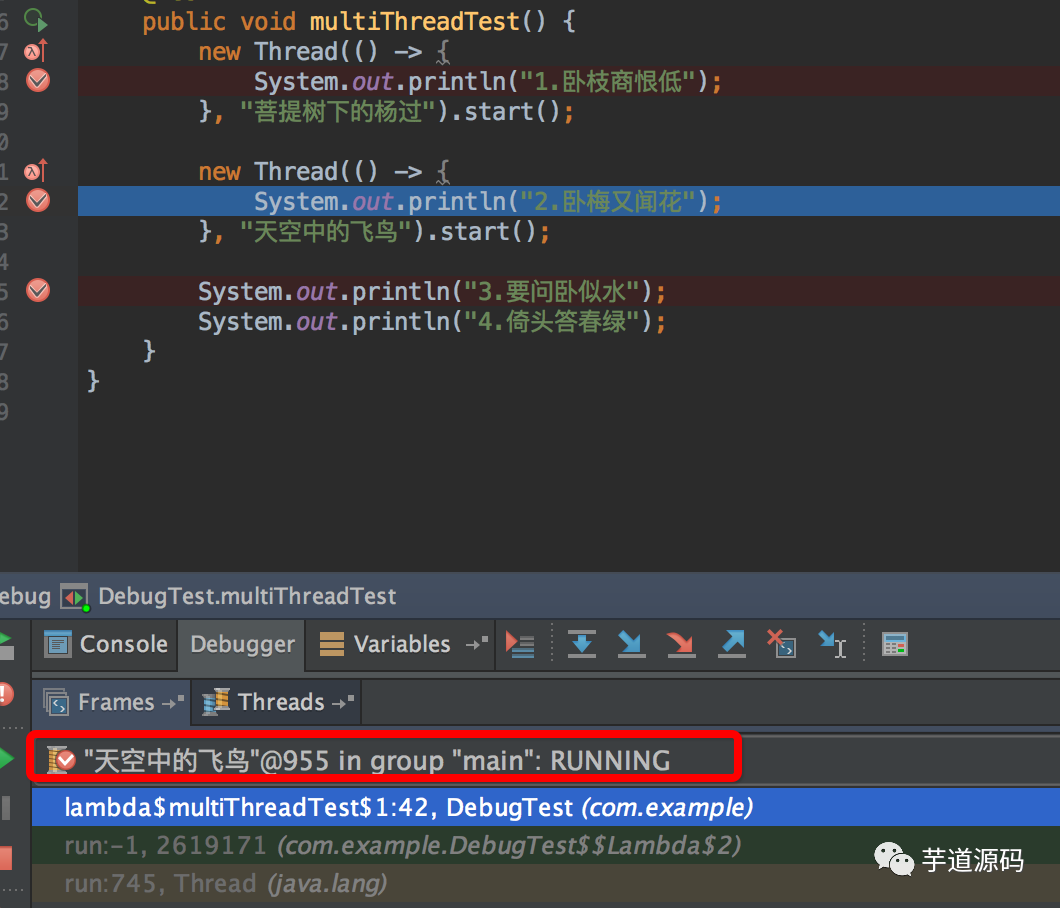 注意上图中的红框位置,断点停下来时,这个下拉框可以看到各个线程(注:给线程起个容易识别的名字是个好习惯!),我们可以选择线程“天空中的飞鸟”