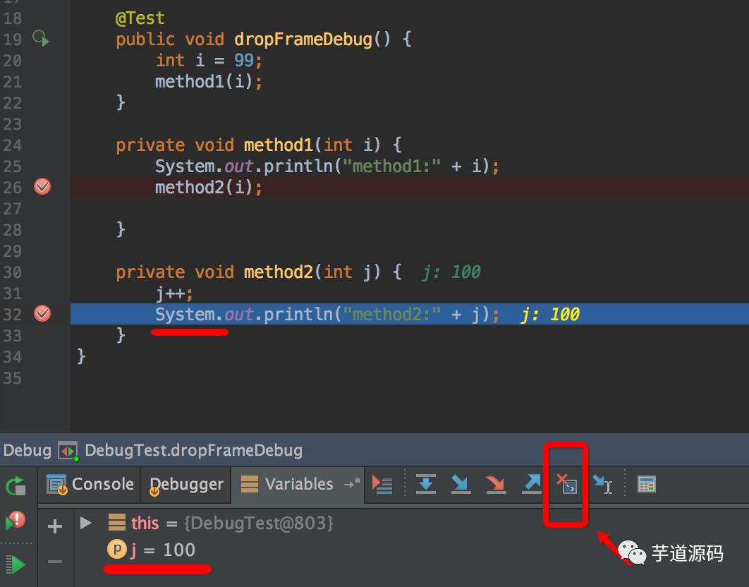 参考上图,method1方法调用method2,当前断点的位置j=100,点击上图红色箭头位置的Drop Frame图标后,时间穿越了