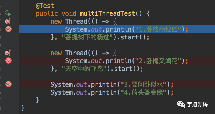 多线程同时运行时,谁先执行,谁后执行,完全是看CPU心情的,无法控制先后,运行时可能没什么问题,但是调试时就比较麻烦了,最明显的就是断点乱跳,一会儿停这个线程,一会儿停在另一个线程,比如下图: