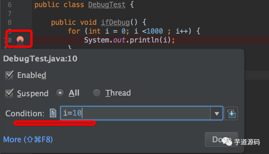 参考上图,在断点的位置,右击断点旁边的小红点,会出来一个界面,在Condition这里填入断点条件即可,这样调试时,就会自动停在i=10的位置