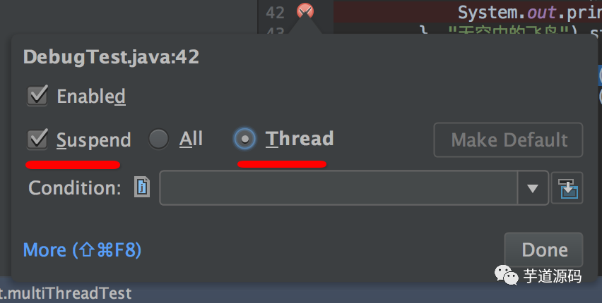 如果想让线程在调试时,想按自己的愿意来,让它停在哪个线程就停在哪个线程,可以在图中3个断点的小红点上右击,