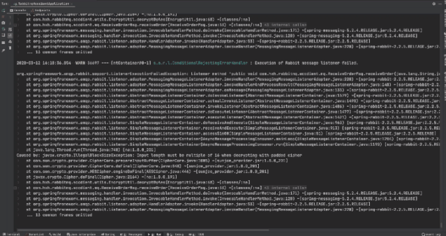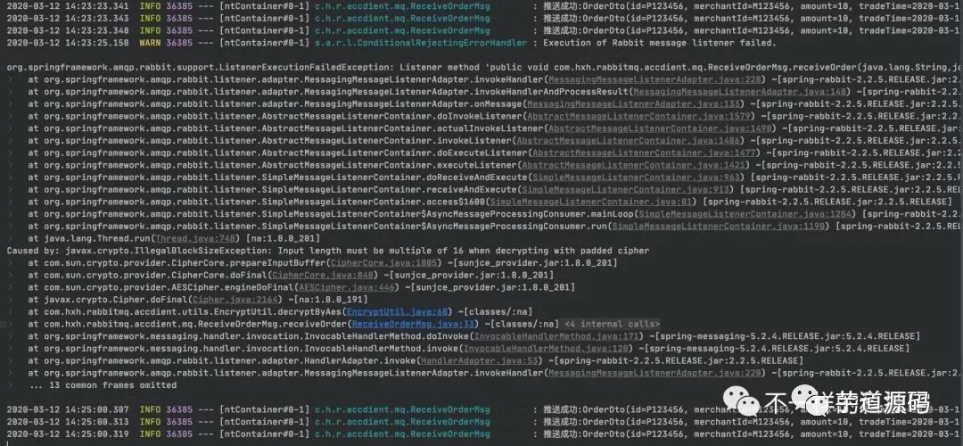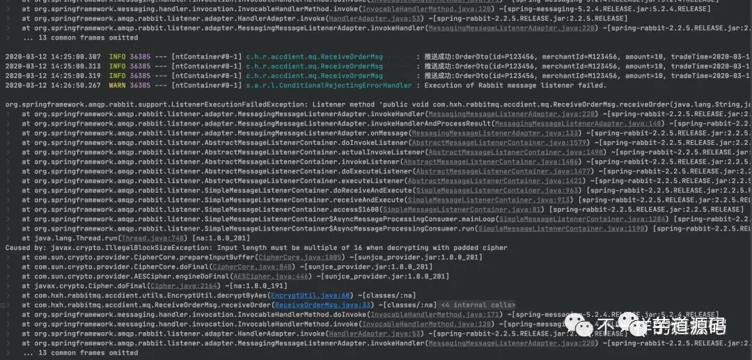 这个时候你会发现控制台报错,当然错误信息是解密失败,但是正常的消息却没有被消费,这个时候其实队列已经阻塞了。