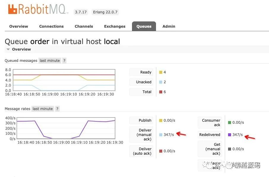 由于大量商户反应收不到推送,我第一反应是不是推送系统挂了,导致没有进行推送。于是让运维老哥检查推送系统各节点的情况,发现都正常。于是打开RabbitMQ的管控台看了一下,人都蒙了。已经有几万条消息处于ready状态,还有几百条unacked的消息。