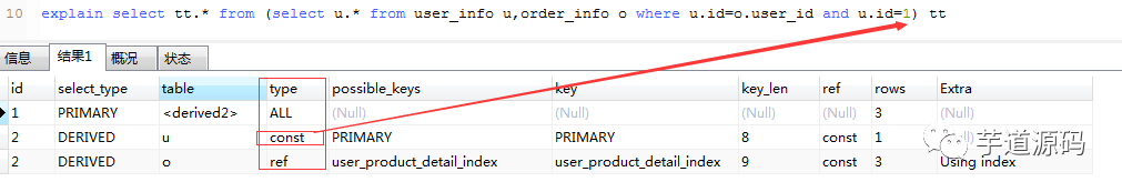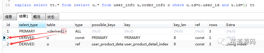 explain select tt.* from (select u.* from user_info u,order_info o where u.id=o.user_id and u.id=1) tt