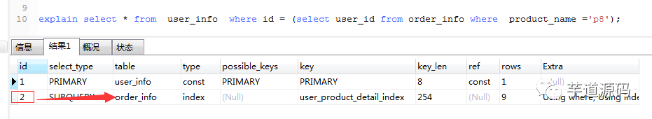 explain select * from user_info where id=(select user_id from order_info where product_name ='p8');