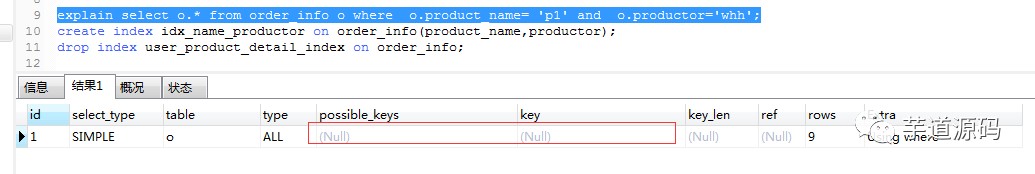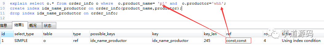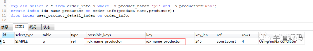 explain select o.* from order_info o where o.product_name= 'p1' and o.productor='whh';