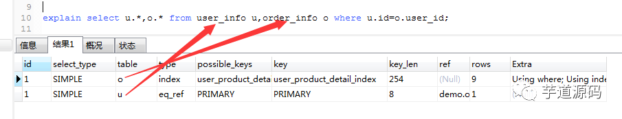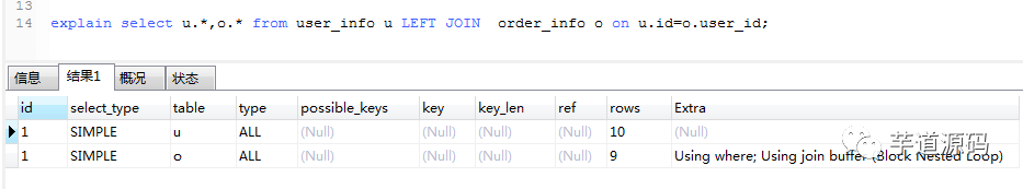 explain select u.*,o.* from user_info u LEFT JOIN order_info o on u.id=o.user_id;