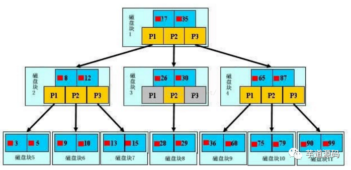 最外层浅蓝色磁盘块1里有数据17、35(深蓝色)和指针P1、P2、P3(黄色)。P1指针表示小于17的磁盘块,P2是在17-35之间,P3指向大于35的磁盘块。真实数据存在于子叶节点也就是最底下的一层3、5、9、10、13......非叶子节点不存储真实的数据,只存储指引搜索方向的数据项,如17、35。
