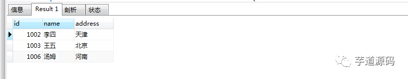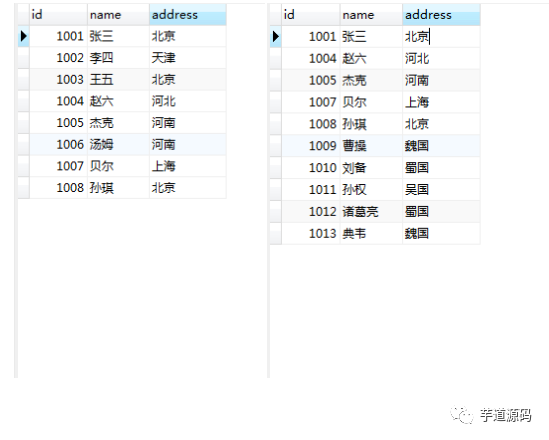 INSERT INTO `t1` VALUES ('1001', '张三', '北京'), ('1002', '李四', '天津'), ('1003', '王五', '北京'), ('1004', '赵六', '河北'), ('1005', '杰克', '河南'), ('1006', '汤姆', '河南'), ('1007', '贝尔', '上海'), ('1008', '孙琪', '北京');
