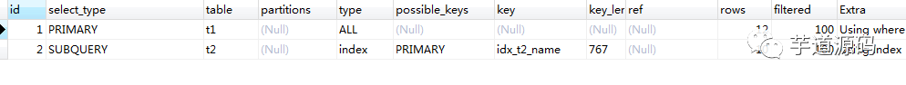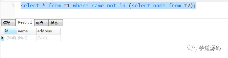 在使用 not in 的时候,需要保证子查询的匹配字段是非空的。如,此表 t2 中的 name 需要有非空限制。如若不然,就会导致 not in 返回的整个结果集为空。
