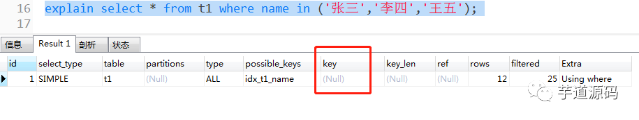explain select * from t1 where name in ('张三','李四','王五');