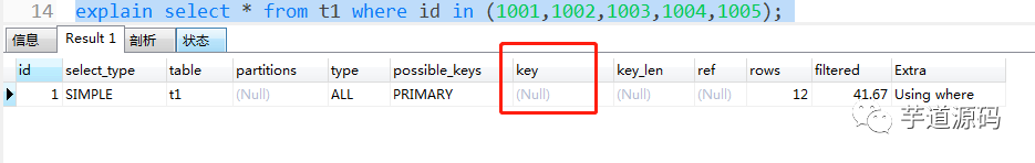 会惊奇的发现,当 id 是四个值时,还走主键索引。而当 id 是五个值时,就不走索引了。这就很耐人寻味了。