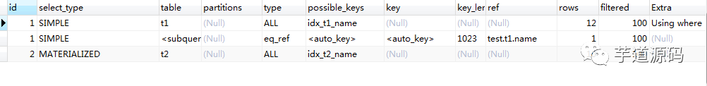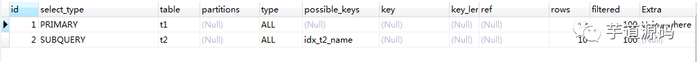 1、 对于 in 查询来说,会先执行子查询,如上边的 t2 表,然后把查询得到的结果和外表 t1 做笛卡尔积,再通过条件进行筛选(这里的条件就是指 name 是否相等),把每个符合条件的数据都加入到结果集中。