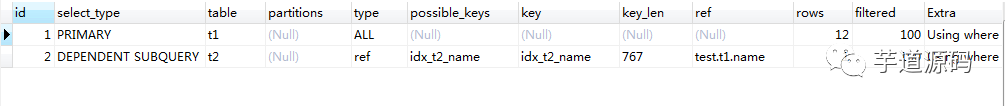 可以发现,对于 in 来说,大表 t2 做外表还是内表,都会走索引的,小表 t1 做内表时也会走索引。看它们的 rows 一列也可以看出来,前两张图结果一样。