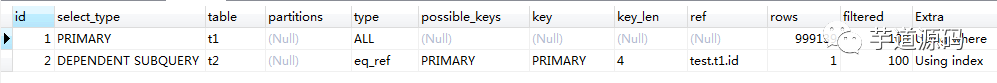 对于 exists 来说,当小表 t1 做外表时,t1 全表扫描,rows 近 100W;当 大表 t2 做外表时, t2 全表扫描,rows 近 200W 。这也是为什么 t2 做外表时,执行效率非常低的原因。