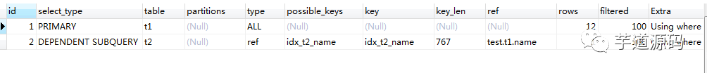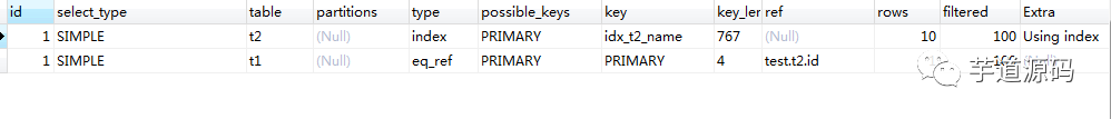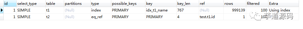 对应于此例,就是从 id 为 1001 开始遍历 t1 表 ,然后遍历时检查 t2 中是否有相等的 name 。