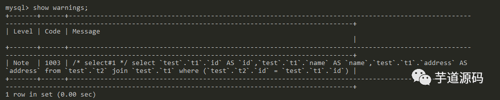 -- 本意为显示警告信息。但是和 explain 一块儿使用,就会显示出优化后的sql。需要注意使用顺序。