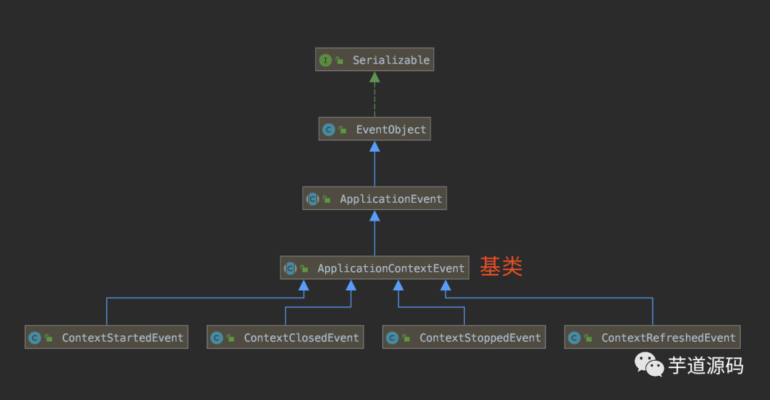 ApplicationContextEvent 是 Spring Context 相关的事件基类,如下图所示: