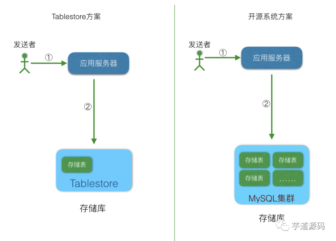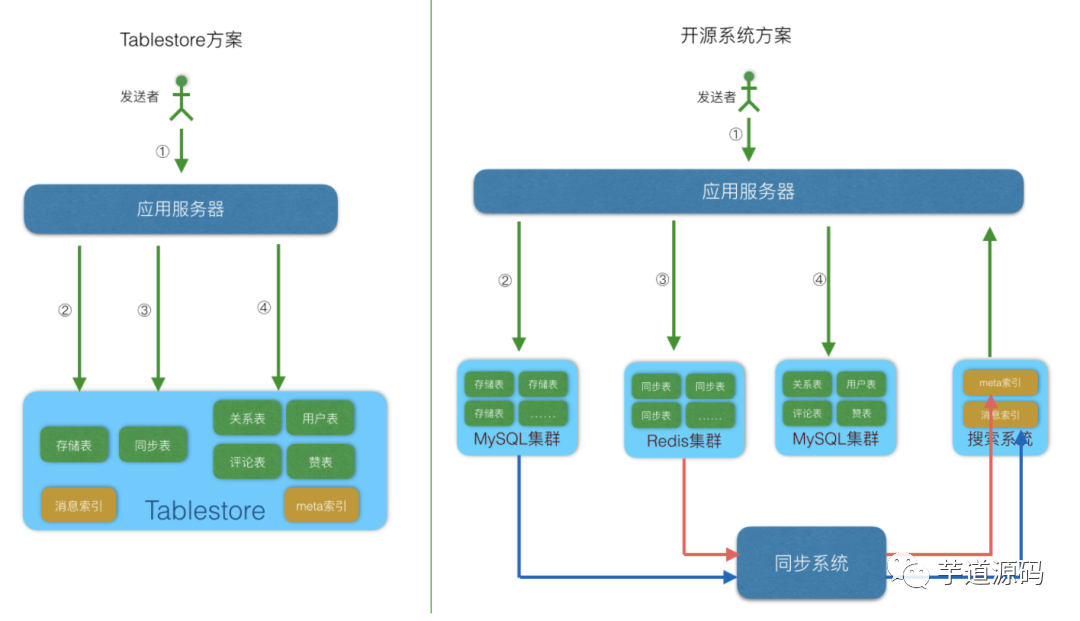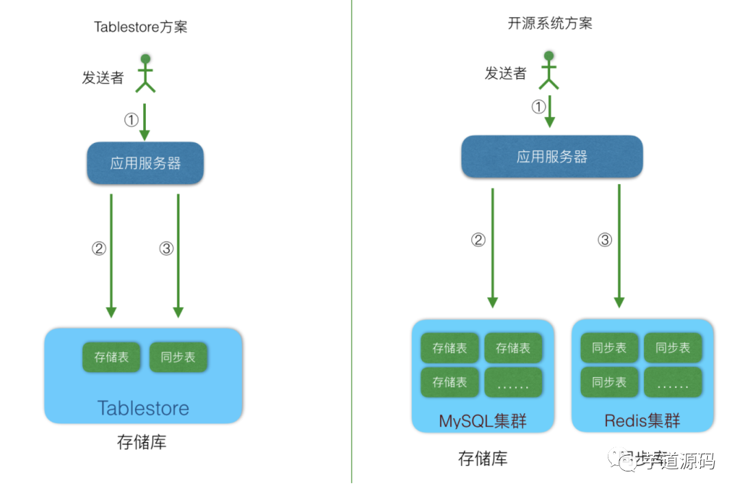 | 解释 | 消息接收者用户ID | 消息顺序ID,可以使用timestamp + send_user_id,也可以直接使用Tablestore的自增列。 | 发送者的用户ID | store_table中的message_id列的值,也就是消息ID。通过sender_id和message_id可以到store_table中查询到消息内容 | 其他内容,同步库中不需要包括消息内容。 |