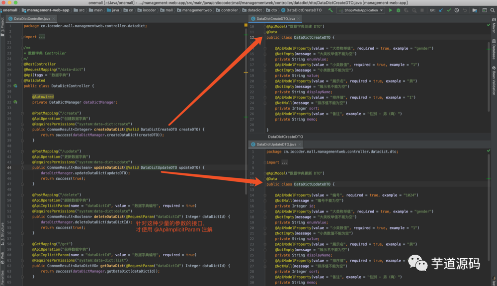 JApiDocs 是通过解析 Controller 源码上的 Java 注释,所以我们需要在相关的类、方法、属性上,进行添加。示例代码如下图:
