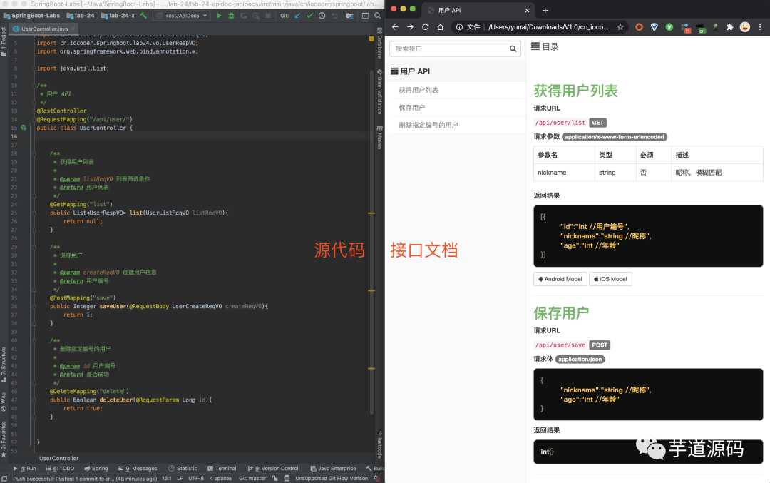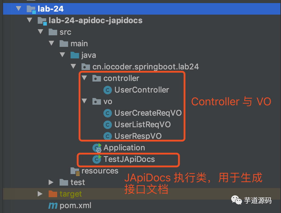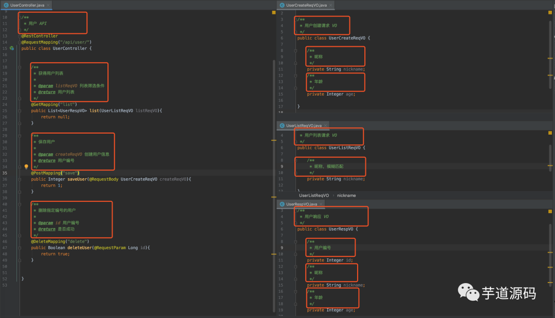 看完了 JApiDocs 生成的接口文档的效果,我们一起来快速入门下。完整的示例项目,可见 https://github.com/YunaiV/SpringBoot-Labs/tree/master/lab-24/lab-24-apidoc-japidocs 地址,代码如下图所示: