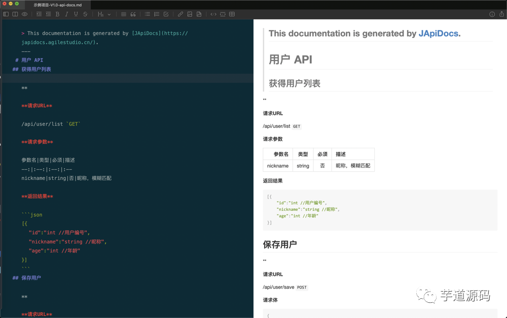 ③ 点击 *-api-docs.md 文件,查看 Markdown 接口文档。如下图所示: