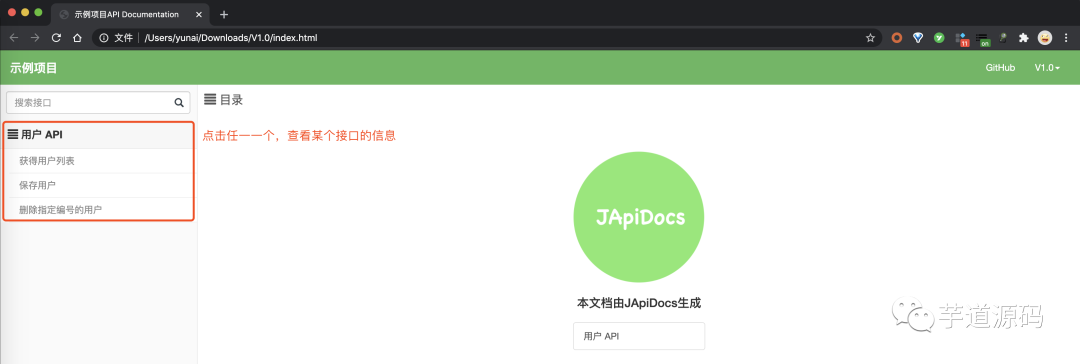 ② 点击 index.html 文件,查看 HTML 接口文档。如下图所示: