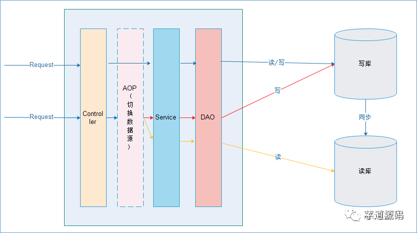 在进入Service之前,使用AOP来做出判断,是使用写库还是读库,判断依据可以根据方法名判断,比如说以query、find、get等开头的就走读库,其他的走写库。