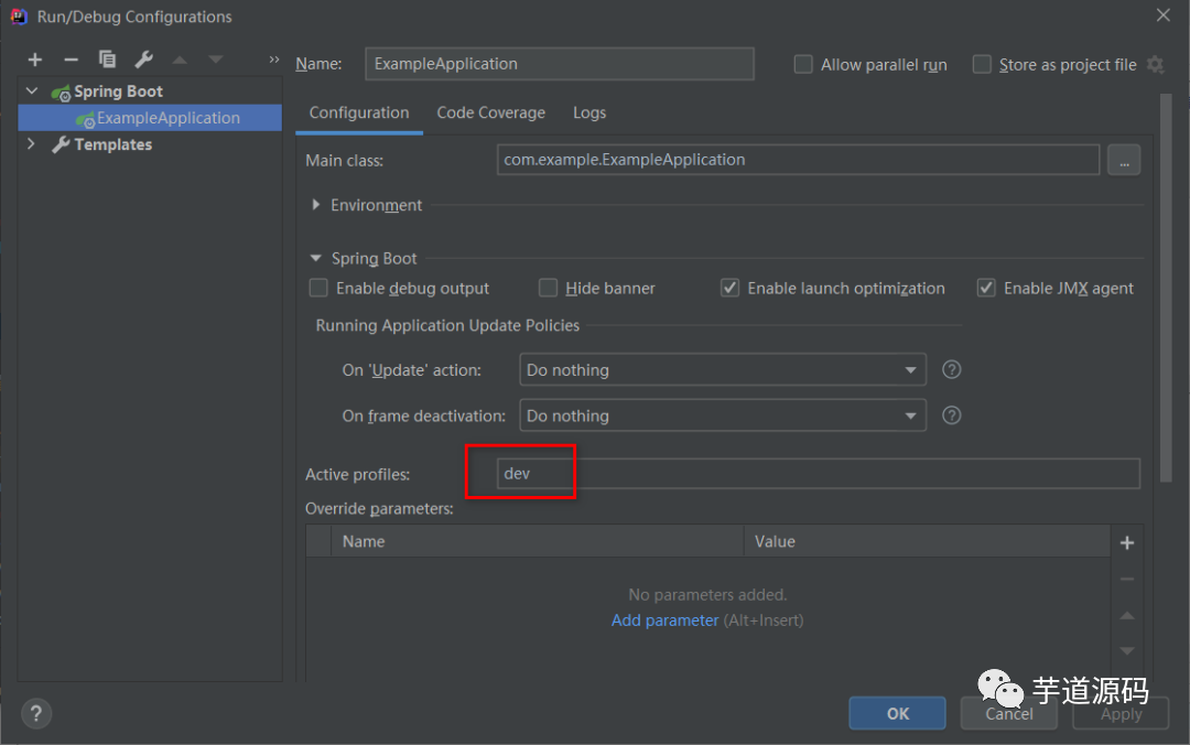 java -Dspring.profiles.active=dev -Dspring.cloud.nacos.config.namespace=ns_dev -jar example-0.0.1-SNAPSHOT.jar