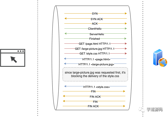 由于 HTTP/2 可以多路传输,因此在 large-picture.jpg 之前返回了 style.css