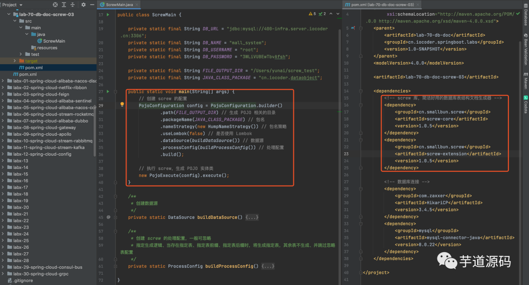 下面,我们来快速入门下。创建 lab-70-db-doc-screw-03 示例项目,使用 screw 的 Java 代码 的方式,生成 Java 实体类。