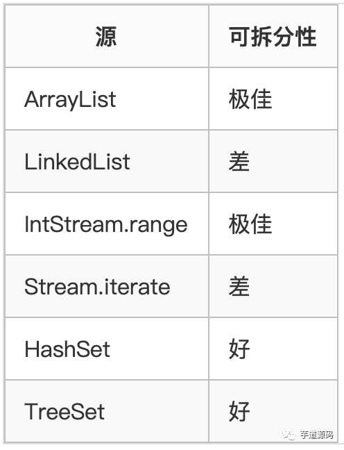 以下是一些常见的集合框架对应流的可拆分性能表: