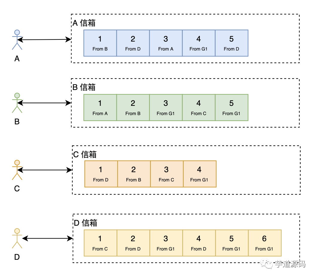 我们先来看看读扩散。如上图所示,A与每个聊天的人跟群都有一个信箱(有些博文会叫Timeline),A在查看聊天信息的时候需要读取所有有新消息的信箱。这里的读扩散需要注意与Feeds系统的区别,在Feeds系统中,每个人都有一个写信箱,写只需要往自己的写信箱里写一次就好了,读需要从所有关注的人的写信箱里读。但IM系统里的读扩散通常是每两个相关联的人就有一个信箱,或者每个群一个信箱。