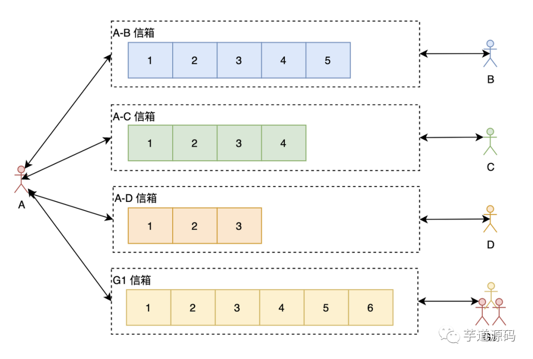 单聊:往自己的信箱跟对方的信箱都写一份消息,同时,如果需要查看两个人的聊天历史记录的话还需要再写一份(当然,如果从个人信箱也能回溯出两个人的所有聊天记录,但这样效率会很低)。