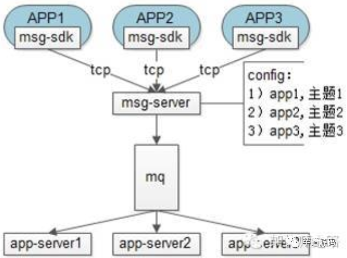 可以看出,msg-server保存了应用跟MQ主题之间的对应关系,msg-server根据这个配置将消息推到不同的MQ队列,具体的应用来消费就可以了。因此,新增一个应用只需要修改配置就可以了。
