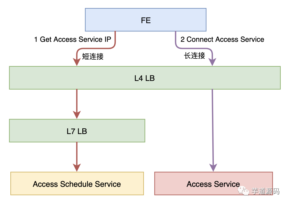 对于长连接的接入层,如果我们需要更加灵活的负载均衡策略或者需要做灰度的话,那我们可以引入一个调度服务,如下图所示: