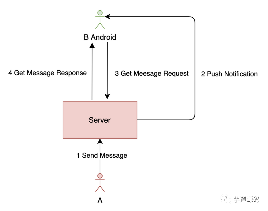 推拉结合模式:有新消息时服务器会先推一个有新消息的通知给前端,前端接收到通知后就向服务器拉取消息