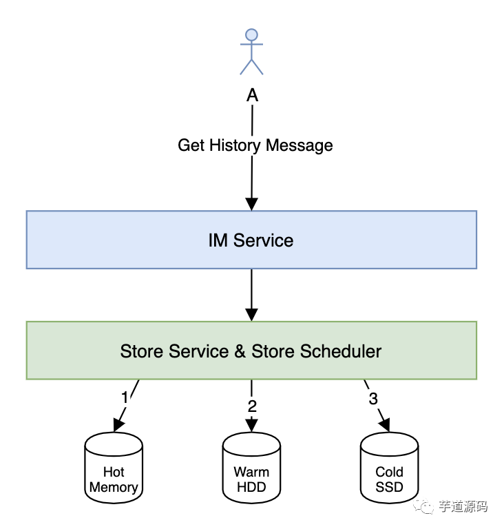 如果我们需要存储几年甚至是永久的历史消息的话(电商IM中比较常见),那么做历史消息的冷热分离就非常有必要了。数据的冷热分离一般是HWC(Hot-Warm-Cold)架构。对于刚发送的消息可以放到Hot存储系统(可以用Redis)跟Warm存储系统,然后由Store Scheduler根据一定的规则定时将冷数据迁移到Cold存储系统。获取消息的时候需要依次访问Hot、Warm跟Cold存储系统,由Store Service整合数据返回给IM Service。