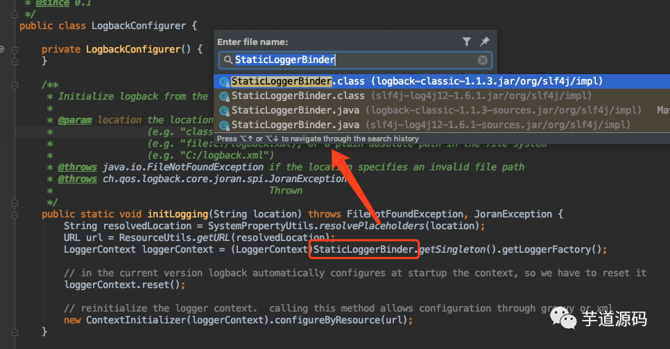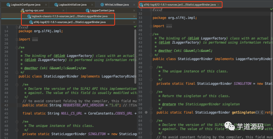可以看到,通过 StaticLoggerBinder.getSingleton().getLoggerFactory() 获取 logger 上下文这段代码报错了,通过仔细定位,发现了有两个 StaticLoggerBinder 类
