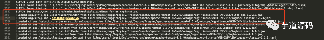 查看 catalina.out 输入日志,发现先加载的是 logback 包中 StaticLoggerBinder